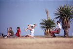 Spectators outside Carswell Air Force Base watch air show from miniature golf course; from left, Nathan Beckman and father Frank; Karen Goldthwait and son Christopehr; and Jake Nail, 11/01/1987