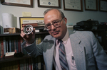 Image shows Dillon William, Assistant professor at UTA, holding a ring that is used in a space device. Published in Fort Worth Star-Telegram Sunday edition December 6, 1987.