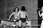 Wrestling match between Al Perez, right, and Kevin Von Erich [Kevin Adkisson] at Will Rogers Coliseum, Fort Worth, Texas. Kerry Von Erich [Kerry Adkisson] is seen outside of the ring at lower left.