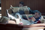 Image shows Kenny Blevins, in front, a senior at UTA, majoring in accounting, studies between classes in the Hereford Student Center lounge. In the background is Holly Cuny, a junior journalism major. Published in Fort Worth Star-Telegram morning edition January 20, 1988.