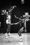 The University of Texas at Arlington (UTA) basketball team playing in Texas Hall against Stephen F. Austin State University. UTA's Willie Brand (#22) seen in mid-air after taking a shot.