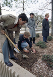 Memorial service for people with AIDS who have died held at University of Texas at Arlington; Chris Luther (left) helps plant a tree on campus with help from Warren Becker and Evan Warrick (right).