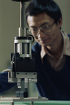 Image shows, research assistant Ted Peng, checking a robot as it positions a circuit at UTA's Automation and Robotics Research Institute. Published in Fort Worth Star-Telegram morning edition February 24, 1988.