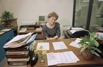Image shows Karen Crouch, executive assistant to City Manager Doug Harman, seated at office desk. She stated that "The worst part of it was having to wait for information" in reaction to Doug Harman's trial. Published in Fort Worth Star-Telegram morning edition February 27, 1988.