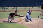 Image shows a baseball game between UTA and St. Francis. Left is St. Francis' Richard Ryser missing the tag on UTA's Pat Woodruff (25) right. Woodruff is shown sliding into a base during the baseball game. Published in Fort Worth Star-Telegram morning edition March 14, 1988.