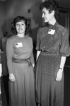 Image shows Elizabeth Leatherwood, left and Treva Lyday, right at a UTA brunch, where he introduced its spring lecture series in the UTA architecture buiding. Published in Fort Worth Star-Telegram morning edition March 23, 1988.