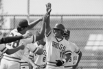 Image shows a baseball game between UTA and TCU. A group of TCU baseball players are shown congratulating Paul Gonzales, right (11) after he made his 13th home run of the season. Published in Fort Worth Star-Telegram morning edition April 28, 1988.