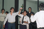 Image shows Ricardo Rodriguez, second from left and Samuel Palacios, center of an immigration services office celebrate as the clock runs down on the amnesty deadline. Published in Fort Worth Star-Telegram evening edition May 5 , 1988.