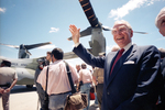 House Speaker Jim Wright waves to a crowd in front of the new V-22 military aircraft at its unveiling ceremony at the Bell Helicopter plant in Hurst.
