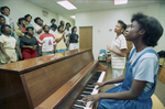 Image shows La Sonja Taylor, center and Eula Lyons, right lead Dunbar Middle School choir in singing praise for Floralyn Green, teacher who has recently died. Published in Fort Worth Star-Telegram morning edition May 31, 1988.