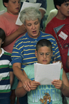 Image shows Clive Blackwell, front, with Carolyn Stover, he gave up a week of vacation to participate UTA Choir Clinic. The clinic helps teachers deal with boys whose voices are changing. A University of Texas at Arlington course sought to help 19 music teachers learn how 25 adolescent boys could participate in the school choir without throwing classmates off key. The student volunteers are between the age of 11 and 14. Published in Fort Worth Star-Telegram morning July 20, 1988.