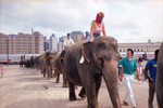 Fort Worth Star-Telegram Wrestling Columnist Betty Ann Stout (Jennifer Briggs-French) riding on an elephant from the Ringling Bros. and Barnum & Bailey Circus during a circus parade in downtown Fort Worth near the T&P Station.