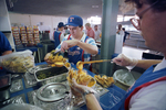 Vendors are seen assembling nachos at a concession stand at Arlington Stadium during a Texas Rangers baseball game.