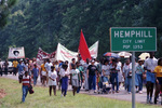 Civil rights protest march in Hemphill, Texas, regarding acquittal of white law officers in the death of a black prisoner, Loyal Garner Jr. The group of protesters can be seen walking in the middle of the street, some are holding banners and flags, the sign of "Hemphill City Limits" can be seen in the foreground.
