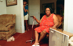 A living room setting. There is a red carpet and couch on the left side of the photo. Next to the couch is a corded phone on the ground. There is a child peering out from a doorway at left. A woman, at right, is sitting with a cane in her right hand and her left hand is resting on a fan donated by Catholic Social Services, 08/10/1988
