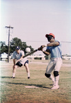 Cowtown Roadrunners, a regional baseball team for visually impaired athletes, practice for the National Beepball Association's World Series; batter swings at a baseball fitted with a high-pitched beeper, 08/14/1988