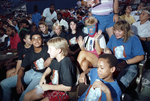 Fort Worth Star-Telegram Wrestling Columnist Betty Ann Stout (Jennifer Briggs-French) joins kids from the Lena Pope Home for a night of baseball at Arlington Stadium. Stout is seen wearing a pink and blue wrestling mask. The Star-Telegram and Stout sponsored 25 kids at the game as part of the column-writing competition with Dallas Times Herald columnist Skip Bayless.