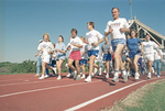 U.S. Vice President George Bush, right, jogs with Texas Christian University students before leaving Fort Worth to head back out on the presidential campaign trail. Several TCU students are seen wearing "Say Goodnight Mike" t-shirts in reference to Bush's opponent in the presidential race, Michael Dukakis.