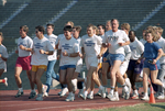 U.S. Vice President George Bush, right, jogs with Texas Christian University students before leaving Fort Worth to head back out on the presidential campaign trail. Several TCU students are seen wearing "Say Goodnight Mike" t-shirts in reference to Bush's opponent in the presidential race, Michael Dukakis.