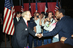 Congressman Jim Wright at bi-partisan celebration in Fort Worth; man on right not identified.