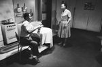 Image shows Ray Hawkins,playing Eddie, seated at table, and Barbara Woods, playing Mama, right on the set of Sojourner Truth Player's production "My Sister, My Sister". Published in Fort Worth Star-Telegram morning edition August 24, 1983.