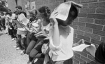 Image shows sophomore, Asimah Othman, architecture major, right, holding newspaper above her head is among other students who were standing in line to sign up for class. Published in Fort Worth Star-Telegram morning edition August 26, 1983.
