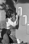 Image shows Tammy Peacock, with paintbrush, letters the Sam Maverick Memory Box for a stationary Homecoming display. Published in Fort Worth Star-Telegram morning edition October 16, 1983.