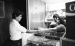 New Isis Theater concession stand. There is a women and a man behind a concession stand counter. The women behind the counter is handing the person on the other side of the counter something. There is candy visible under the glass counter.