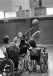 During a wheelchair basketball game between Fort Worth and Arlington teams, Eric Harris (left) and Monty Youngblood of Arlington tip the ball, 11/09/1983