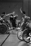 During a wheelchair basketball game between Fort Worth and Arlington teams, Jeff Church looks for a receiver for the ball, 11/09/1983