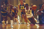 UT-Arlington's Ronell Peters heads down the court after stealing the basketball Texas A&I's Troy Brown in the game at Texas Hall. Javelinas gave chase but couldn't head off Peters or UTA, which won the non-conference game 69-64. Published in Fort Worth evening edition November 29, 1983.