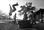 A group of children are seen taking turns doing backflips off of a stack of tires in the Cavile Place housing project in the Stop Six neighborhood of Fort Worth.
