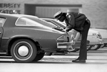 Larry Burrell, UTA (University of Texas at Arlington) Police Guard using the rear end of a car as a table when writing a parking violation in the UTA bookstore parking lot on the first day of classes. The day was full of issuing parking tickets. Published in Fort Worth Star-Telegram morning edition January 17, 1984.