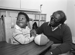 At Tarrant County Day Care Center for Children with Disabilities. Children with intellectual and physical disabilities are looked after. There is an unidentified African American child sitting at a feeding table, his caregiver is holding his hand.