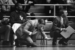 Texas Wesleyan couch Richard Hoogendoorn gives out a yelp and slaps the floor with the palms after one of his Rams missed a shot during a tense moment in the later stages in the game against the UTA (University of Texas at Arlington) Mavs at Texas Hall. Rams won 80-77. Published in Fort Worth Star-Telegram evening edition February 7, 1984.