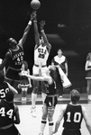 UTA's (University of Texas at Arlington) Ike Mitchell (25) and Arkansas State's Reggie Gordon chase a loose ball during the game. Published in Fort Worth Star-Telegram evening edition February 24, 1984.