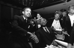 Image shows actor and playwright, Ossie Davis, left shaking hands with Bob Ray Sanders, center, at a reception for Davis and his wife, Ruby Dee, at Century II. The Davises are celebrating the Sojourner Truth Players' production of Davis' "Purlie", a production playing at the 1101 Fabons theater. Sanders is the director. Published in Fort Worth Star-Telegram morning edition March 12, 1984.