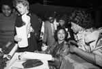 Image shows actor, Ruby Dee, center, wife of actor-playwright, Ossie Davis, takes a break from singing and converses with Sojourner Truth Players Theater producer Charlese Thomas,right, during a reception at Century II Club. The Davises are celebrating the Sojourner Truth Players' production of Davis' "Purlie", a production playing at the 1101 Fabons theater. Published in Fort Worth Star-Telegram evening edition March 12, 1984.