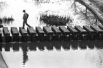A student cast a reflection as he crossed the creek running through The University of Texas at Arlington campus. The stone walkway connects the main campus to the south parking lot near Mitchell Street. Published in Fort Worth Star-Telegram morning edition March 13, 1984.