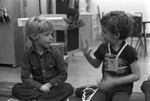 Hearing-impaired children in sign language conversation at Regional School for the Deaf in Fort Worth, 03/14/1984