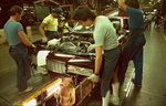 General Motors plant, Arlington - G. M. workers on assembly line assemble 1986 Chevrolet Monte Carlo; chris Middleton pulls front fender closer to car, 04/03/1986