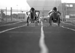 Jim Hayes (left) and Ronnie Eaton(right) race in a dead heat while working out at Lamar High School, Arlington, Texas, for the National Wheelchair Track Championships at Tennessee State University. Both men can be seen in their racing chairs.