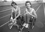 Jim Hayes (left) and Ronnie Eaton (right) take a break from training during work out at Lamar High School, Arlington, Texas, for the National Wheelchair Track Championships at Tennessee State University. Both man are using their racing chairs and smiling at the camera.