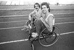 Jim Hayes (left) and Ronnie Eaton take a break from training during work out at Lamar High School, Arlington, Texas, for the National Wheelchair Track Championships at Tennessee State University. Both men are in their racing chairs smiling and looking at the camera.