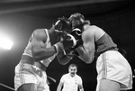 Image shows Mike Tyson, left and Henry Milligan, right trading punches during a bout in Olympic Boxing Trials in boxing ring. Mike Tyson won the fight. In background is a unidentified referee. Published in Fort Worth Star-Telegram morning edition June 10, 1984.