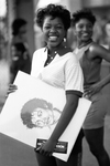 A fan holds a drawn portrait of Michael Jackson under her arm before entering Texas Stadium in Irving to see Michael Jackson in concert.