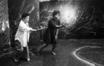 Image shows Laurie Carlos, left, rehearsing and helping Barbara Olajade, right at the Sojourner Truth Center. They are standing in front of a marbel designed walls. Published in Fort Worth Star-Telegram evening edition August 24, 1984.