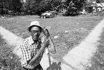 Calvin Littlejohn, pictured holding a gardening hoe and roll of papers. Littlejohn, leader of one of the subdistricts of Near Southeast Citizens Committee, is planning a garden cooperative program in Fort Worth, Texas. The Near Southeast Citizens Committee was awarded a $5,000 community development grant for seed purchase, equipment rental, and other supplies needed to get the garden project started. Houses and pickup trucks can be seen in the background, as well as an unhitched trailer.