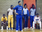 Fort Worth's Dunbar High School basketball coach, Robert Hughes, watches action during tryouts for the team; students not identified.