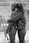 Elton Bell, 20, and Mary Jones, 19, listen to instruction during marching band rehearsal at UTA (University of Texas at Arlington). The band practiced when temperatures dripped to the low 50s, to prepare for Homecoming. Published in Fort Worth Star-Telegram morning edition October 23, 1984.